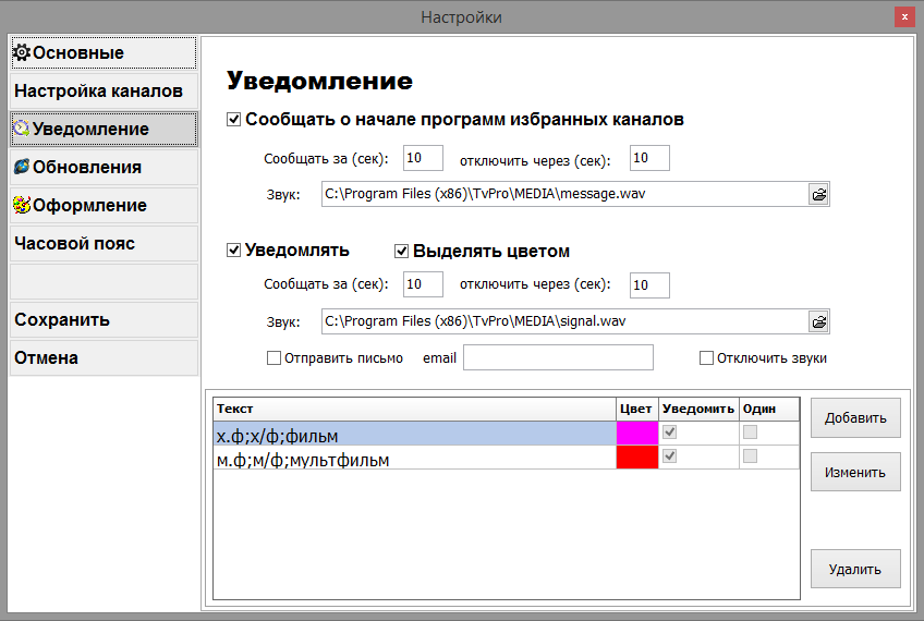 - Уведомление о наступлении телепередач